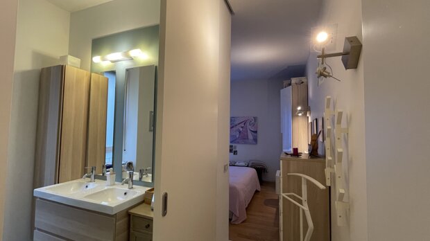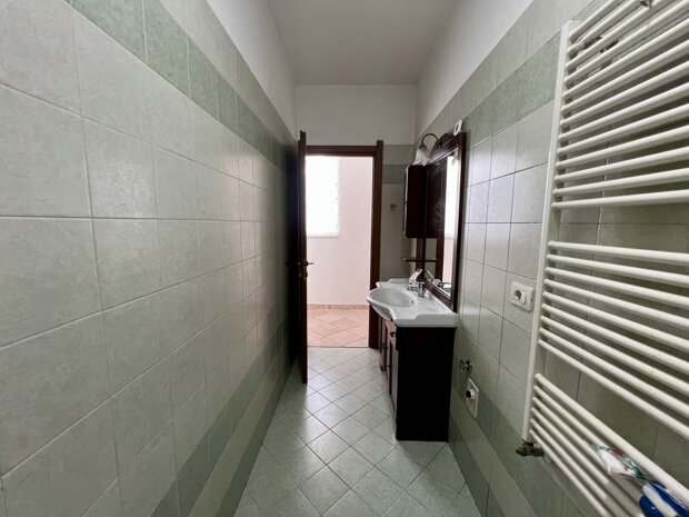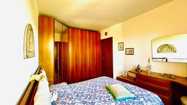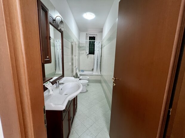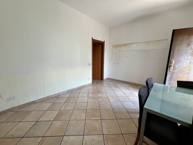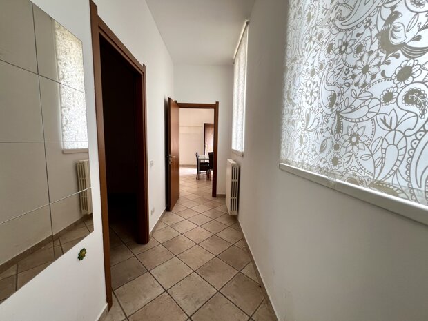 L’ingresso si apre su un soggiorno luminoso, separato dalla cucina abitabile. Un disimpegno ampio conduce alla camera matrimoniale e al bagno finestrato, situato all'inizio dell'appartamento sulla destra, suddiviso in antibagno e WC, e dotato di finestra.
