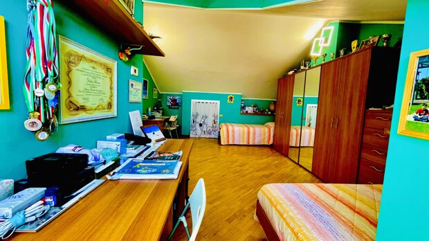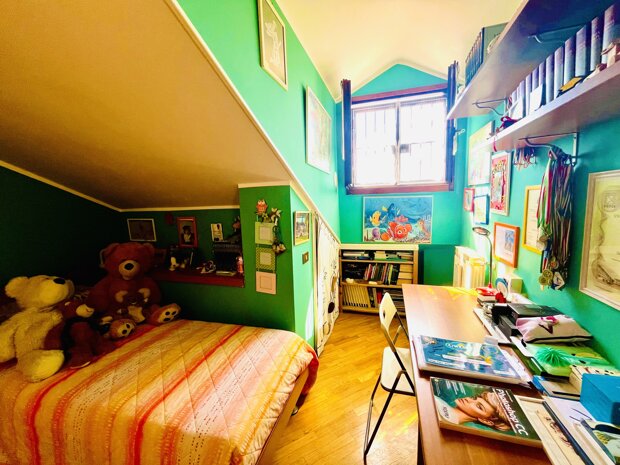 Al primo piano si trovano la camera matrimoniale con balcone affacciato sull’ingresso, una luminosa cameretta con balcone panoramico sui campi circostanti e un bagno finestrato con vasca. Il sottotetto, non abitabile, offre un ampio ambiente con ripostiglio, utilizzabile come studio, stanza hobby o locale multiuso.