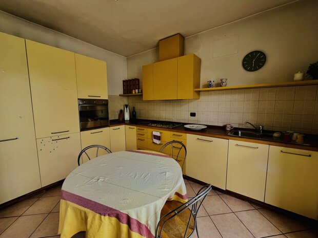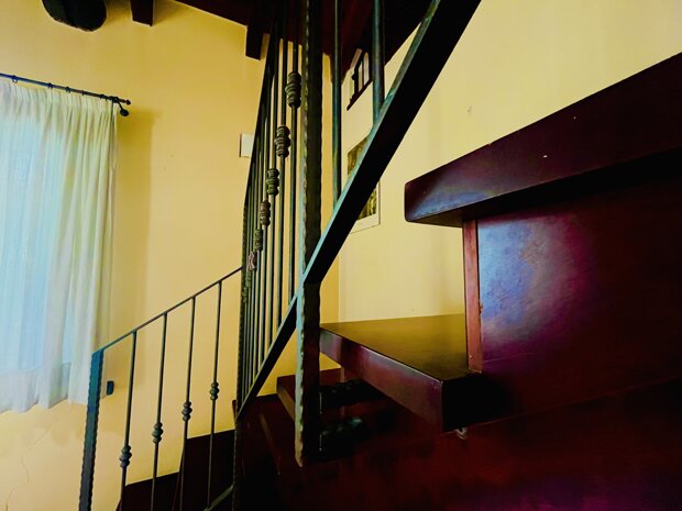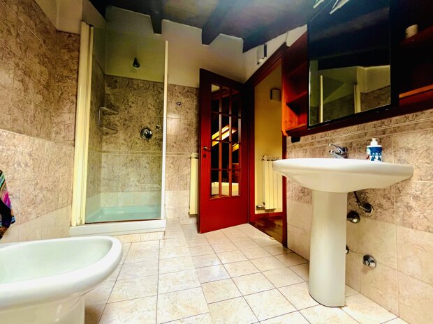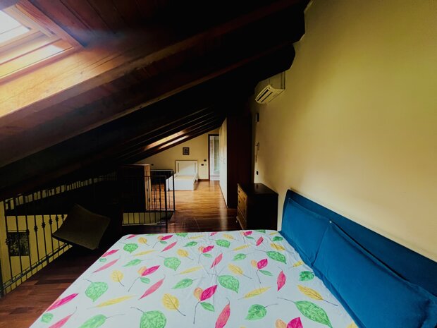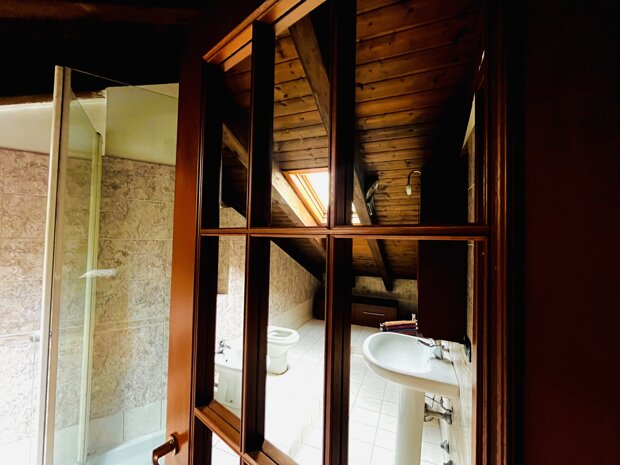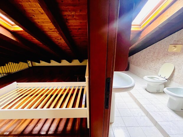 L’ingresso apre su un ampio salone luminoso, impreziosito da un grande terrazzo a livello di circa 18 mq, vero valore aggiunto della casa: uno spazio ideale per chi desidera vivere anche all’aperto, magari allestendo un angolo verde o organizzando momenti conviviali. La cucina, separata e abitabile, affaccia anch’essa sul terrazzo, rendendo la zona giorno pratica e ben connessa agli spazi esterni. Un disimpegno conduce al bagno, finestrato e completo di vasca da bagno. Una scala interna in legno collega il piano superiore, dove troviamo un ampio sottotetto con travi a vista, un ambiente unico ma funzionale e ben illuminato grazie a due grandi velux, e un secondo bagno, con doccia e velux.